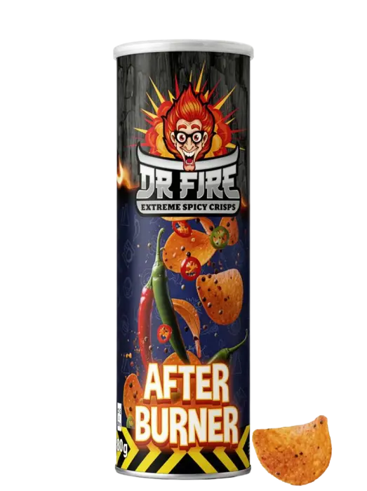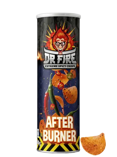 Efterbränningen som inte ger sig! Dr Fire Extreme Spicy Crisps After Burner är chips som fortsätter bränna länge efter sista tuggan. Extremt heta och kryddiga chips med flera lager av hetta - perfekt för dig som tycker att vanliga starka chips är för tama. Varning: hettan växer för varje tugga och släpper inte taget! 🔥💀