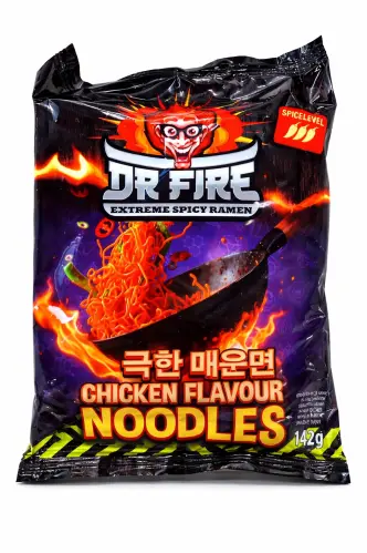 Extremt het kycklingramen! Dr Fire Extreme Spicy Ramen Chicken Flavour Noodles är nudlarna för den modiga - extremt heta och kryddiga med kycklingsmak. Spice level 3 - inte för känsliga munnar! Perfekt för dig som älskar het mat och vill testa gränserna. Varning: detta är ingen lek! 🔥🍜