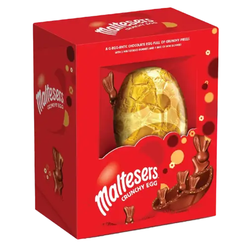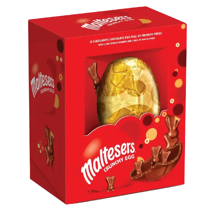 Påskens texturfest! Maltesers Giant Easter Egg förför med sitt generösa skal av krämig mjölkchoklad som gömmer en skatt av klassiska Maltesersbitar inuti. Upplev den oemotståndliga kontrasten mellan det släta chokladskalet och de krispiga, luftiga maltbitarna som smälter och knastrar på samma gång. En lyxig chokladupplevelse där varje bit erbjuder Maltesers signaturkombination av spröd krispighet och len mjukhet.