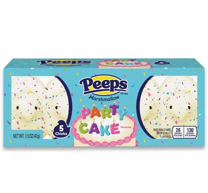 Söta marshmallow-kycklingar med tårtsmak! Peeps Marshmallow Party Cake Chicks är de klassiska amerikanska marshmallow-kycklingarna med festlig tårtsmak och färgglatt strössel. Mjuka, söta och fluffiga kycklingar med party cake-smak - glutenfria och fettfria. Perfekt till påsk eller för dig som älskar marshmallows! 🐣🎂