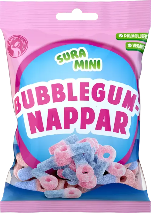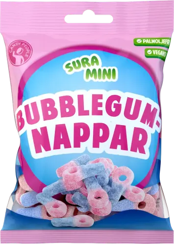 Sura Mini Bubblegumsnappar är nappformade godisar med en fräsch bubblegumsmak och sur beläggning. Dessa roliga minisnappar kombinerar det bästa av två världar - den klassiska tuggummismaken med en överraskande sur kick. En lekfull godisupplevelse som får dig att suga lite extra.