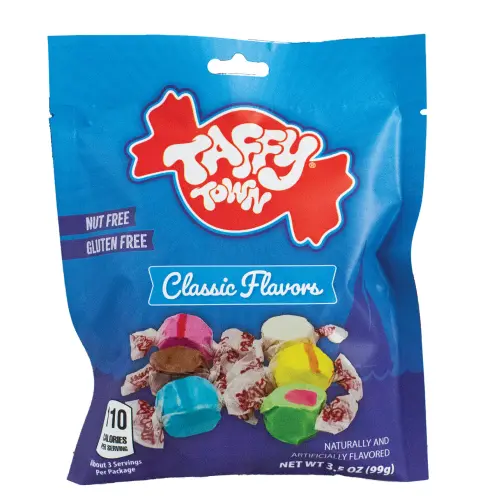 Klassiskt och gott! Taffy Town Classic Flavours är sex tidlösa favoriter i mjuk amerikansk saltwater taffy. Här får du banan, vattenmelon, hallon, choklad, körsbär och vanilj - varje bit är intensiv och smälter på tungan. Len, tuggbar taffy som levererar ren godisnostalgi i varje smak. Perfekt när du vill ha något klassiskt och tryggt!